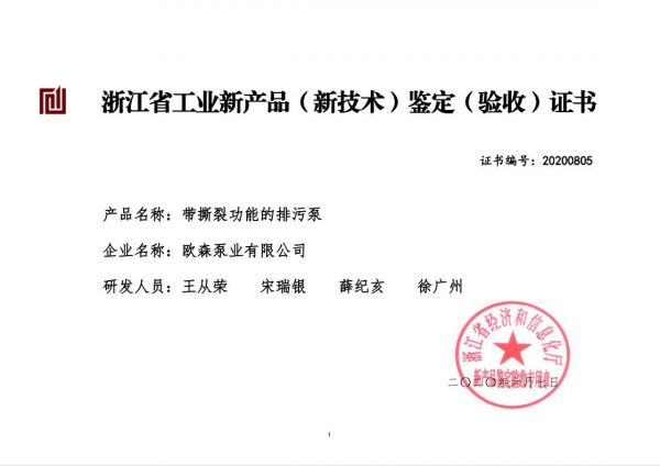? ? ? 2020年6月10日,,歐森泵業(yè)有限公司收到由浙江省經濟與信息化廳下發(fā)的三項新產品 (新技術)鑒定驗收證書。三項新產品分別為:方便清除堵塞物的自吸排污泵、懸浮葉輪污水泵、帶撕裂功能的排污泵。