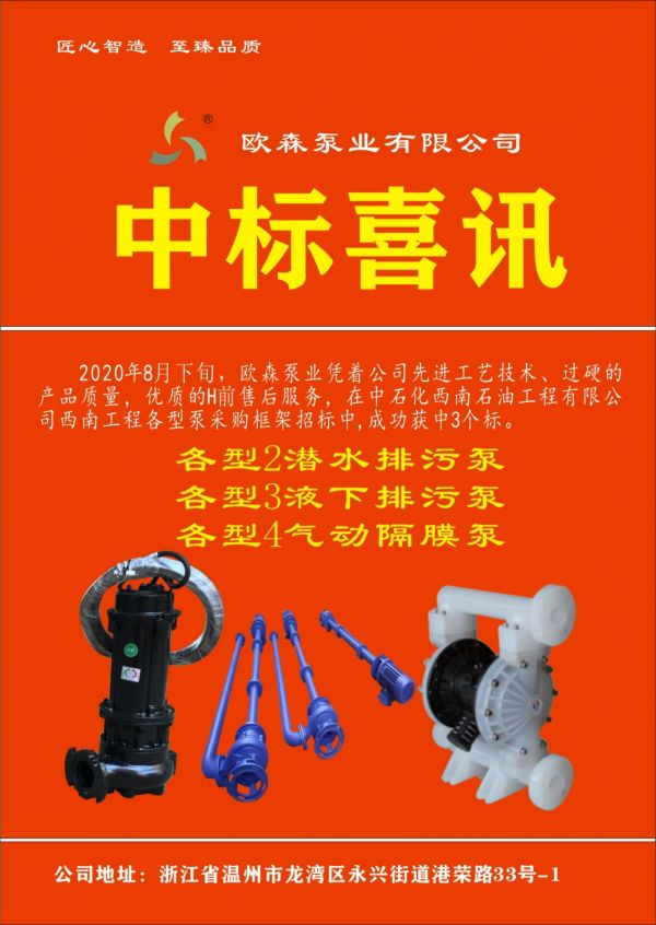 ? ? ? ?歐森泵業(yè)有限公司在2020年8月參加中石化西南石油工程有限公司西南工程2020年各型泵采購項目招標中成功獲中三個產(chǎn)品類型框架協(xié)議標。即為各型2潛水排污泵、各型3液下排污泵、各型4氣動隔膜